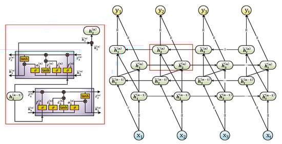 where is the hidden state of the Layer at time . Each hidden state is composed of forward and reverse superposition. The related equations are denoted as follows: