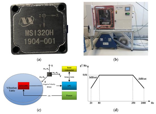 The MSI320H MEMS Inertial Measurement Unit (IMU) was employed for experiments. This consists of a three-axis MEMS gyroscope and a three-axis MEMS accelerometer. The real picture and the gyroscope specifications of MSI320H are shown in Figure 3a and Table 1, respectively. The MSI320H was fixed on the vibration table. A picture of the vibration table is shown in Figure 3b. The data acquisition procedure of the MSI320H is shown in Figure 3c. Data from the MSI320H was sent to the xPC via the RS422 communication interface with a Baud of 921,600 bps. The xPC decoded the gyroscope data and sent it to the host computer via the network cable. The MSI320H was preheated at room temperature with power for 20 minutes. Then, linear vibration experiments were performed. The vibration direction of the vibration table is the y-axis of the gyroscope, and the power spectral density (PSD) of the linear random vibration loads is shown in Figure 3d.