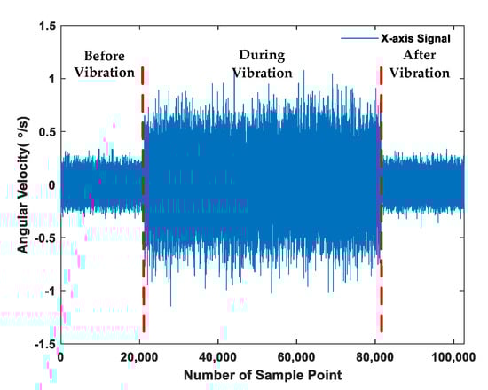 where g. The sample rate was set to 200 Hz, and approximately 60,000 data were acquired in the random vibration environment. The variation of gyroscope x-axis signal affected by random vibration is shown in Figure 4, and the error of the gyroscope increased significantly in random vibration environments.