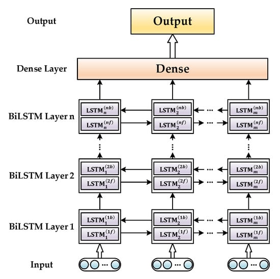 Information flow of multi-layer bidirectional long short-term memory (BiLSTM) network.