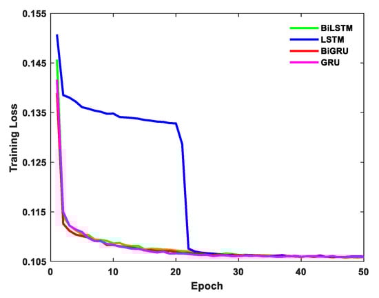 Training loss of BiLSTM, LSTM, BiGRU, and GRU.