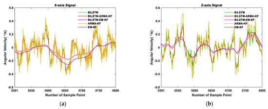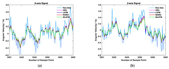 Comparison of error compensation performance of BiLSTM, LSTM, BiGRU, and GRU. (a) Part of the x-axis data zoomed-in and (b) part of the z-axis data zoomed-in.