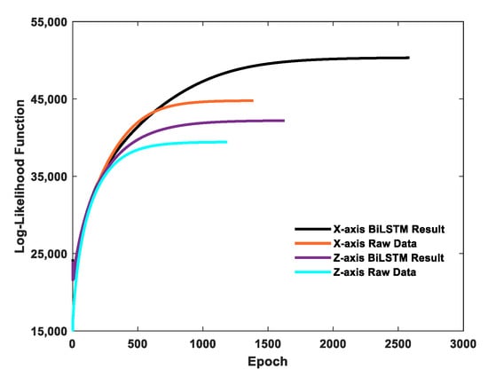 According to the test, after eliminating the trend term, the raw data and BiLSTM network results of the x-axis and z-axis met the stationarity and normality requirements. The test process is shown in Appendix A. Moreover, as illustrated in Figure A1, the autocorrelation function and partial autocorrelation function diagrams exhibit trailing properties, and all models can be identified as an ARMA model.