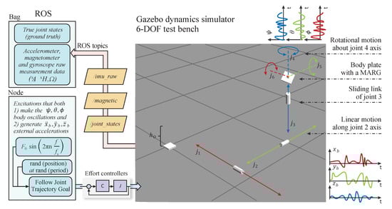 A test environment that satisfies the aforementioned requirements is depicted in Figure 1. This environment contains a 6 DOF platform that alters the pose (both position and orientation) of an MARG unit in the 3D space. The closed-loop structure simulates dynamic circumstances, i.e., the 6 DOF platform executes the desired mixture of static and dynamic system behaviors based on the supplied reference signals. Since both the system dynamics and sensor models are included in this environment; therefore, the acquisition of true system states (true position and orientation of the MARG frame), along with raw sensor data, is supported. These measurements contributes to post-processing, such as the analysis of dynamic effect on estimation process, filter performance quantification (i.e., state estimation error determination), and optimization of filter parameters. These attributes form the main advantages of the proposed environment, which has been implemented in both ROS/Gazebo and MATLAB/Simulink. Moreover, video demonstrations of the closed-loop dynamics, along with the ROS/MATLAB-based program packages, have been made publicly available on the author’s website [34].