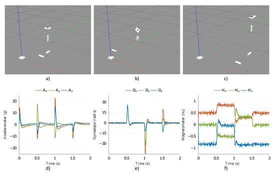 (a–c) Snapshots during the motion of the 6 six-degrees of freedom (6 DOF) platform; (d–f) raw measurements of the attached magnetic, angular rate, and gravity (MARG) unit.