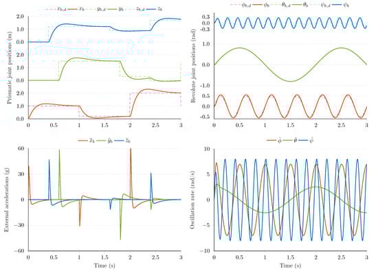 Figure 3 highlights the closed loop dynamics achieved with the derived controllers. In the first row, the reference tracking performance is highlighted for both the prismatic and revolute joints. It can be observed that the prismatic joints maintain the desired , , and spatial coordinates and fulfill the control requirements. Namely, the settling time for each actuated joint is less than 1 s; moreover, the reference values are tracked with reasonable overshoot (the overshoot is a must have requirement, since it results in additional external acceleration, which can be incorporated into the quality verification of estimation algorithms). In the experimental results, the reference values are supplied with approximately 1-s period for the prismatic joints, while the revolute joints are required to track , , and sinusoidal signals with different amplitudes to maintain the desired roll, pitch, and yaw angles.