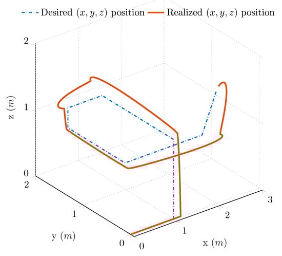 Figure 4 depicts the spatial motion of the linear joints during the aforementioned experiment. The blue curve highlights the reference trajectory (, and ), while the red curve shows the realized trajectory during the 3 s-long experiment. An apparent difference can be observed between the blue and red curves, due to the fact that the new desired spatial coordinates have been supplied earlier than the settling of the prismatic joints controllers. Moreover, the desired spatial coordinates are supplied in different time instances; therefore, even if one prismatic joint controller settles, the other two controllers are either in the rising time phase or overshoot state, thereby resulting in discrepancy in either one or two coordinates. However, this discrepancy in trajectory tracking does not influence the task and goal of the environment at any manner, since every control requirement is satisfied; moreover, the test environment enables the generation of different dynamic conditions in the 3D space.