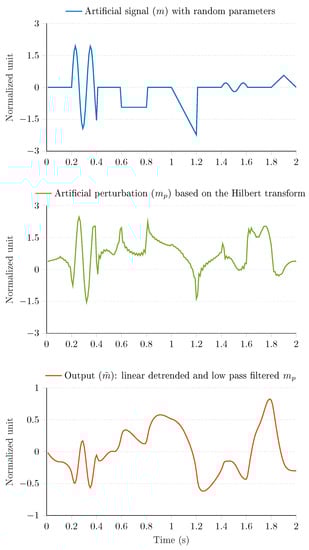 - Extract the continuous linear trend of the artificial perturbation signal by subtracting a straight line from , where denotes the best linear fit to in the least squares sense:Then, apply low-pass filtration to the detrended signal () via a second order Butterworth infinite impulse response (IIR) filter to obtain the output ():where ; moreover, and filter coefficients are obtained based on the cutoff frequency of the filter. In this algorithm, the cutoff frequency was selected to be . The output of the algorithm is shown in the third row of Figure 5.