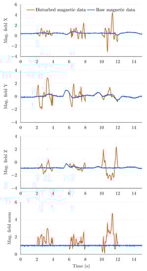 Figure 5 highlights that the aforementioned algorithm produces realistic magnetic perturbation signals; therefore, it can be effectively used in the test environment to generate various real world scenarios, where the magnetometer data is disturbed due to environmental changes, such as the effect of ferromagnetic materials. Figure 6 illustrates the application of the proposed algorithm on raw magnetometer data. The blue curves indicate the raw undisturbed magnetometer measurements, while the red curves indicate particular sections, where the measurement was disturbed by the proposed algorithm. It can be seen that the algorithm altered the raw sensor signals three times during the 15 s-long measurement. In the last row of Figure 6 the magnitude of magnetometer data is shown, where the red curve highlights the effect of the perturbation algorithm (i.e., the norm of measurements has increased to approximately five times of the raw data norm during the perturbation events). These figures demonstrate that the algorithm provides useful output for simulating random realistic magnetic perturbations.