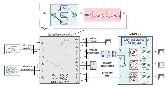 Regarding the MATLAB-based implementation, the state-space dynamics of the 6 DOF test platform (Equation (10)) has been implemented with a Simulink S-function block. Each joint is controller in closed-loop; therefore, six position input effort output-type controllers have been implemented (Equation (14)) to maintain the desired joint coordinates. The PID parameters have been obtained using Equation (17). The MARG unit is connected to the end of the kinematic chain and is composed of accelerometer and gyroscope Simulink blocks, along with a custom-made magnetometer model (see Equation (18)). In the current implementation, it is assumed that the sensor models are calibrated (bias terms are zero vectors); moreover, zero scaling and no misalignment are considered in Equation (18). However, these values can easily be modified in the corresponding Simulink sensor blocks, if more advanced problems need to be examined. Figure 7 shows the implemented model in MATLAB/Simulink.