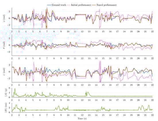 It can be observed that the test environment effectively fostered the tuning procedure of each filter algorithm. The initial filter outputs (pink curves) contained notable estimation errors; therefore, the default filter parameters did not contribute to an acceptable filter performance during the executed dynamic motions. However, the tuning of filter parameters could easily be performed in the environment, which resulted in improved filter performances. The effects of external accelerations, vibrations, and magnetic perturbations can also be observed in the measurement results. These external disturbances significantly decrease the performance of each filter during the first 12 s in the experiment. These effects can be handled more effectively in adaptive filter structures. The analysis of adaptive filters exceeds the scope of this article, but, in fact, the test environment aims to effectively support the development and evaluation of such novel techniques.