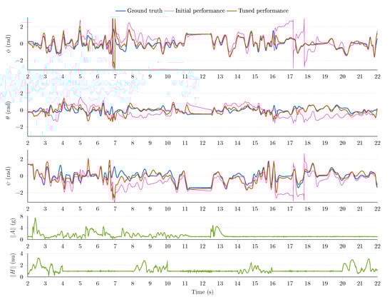 Providing accurate pose estimates (i.e., position and attitude results) is a crucial task in the control of agile mobile systems, such as robots. Since the controller and estimator algorithms are linked in closed-loop, therefore, the estimator algorithm should meet important design requirements. Such requirements ensure that the controller algorithm successfully stabilizes the system in the close vicinity of the desired state based on the estimation results [1,2,3]. If these conditions are not satisfied, then the system can easily be driven to unwanted states, which may eventually damage the hardware [4,5,6,7]. As a result, the estimator algorithm should be both analyzed carefully during dynamic conditions and tuned properly in order to provide accurate and robust results [8,9,10,11].