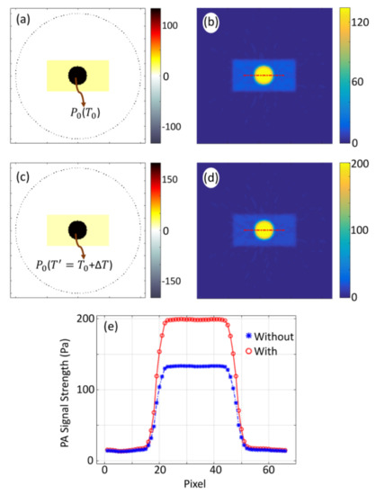 A circular target of radius ∼ having contrast in in comparison to that of the background is situated at the center of the background of area . This numerical sample represents the deep-seated inhomogeneous target illuminated with CW-laser (to raise the temperature) in the background tissue medium. A circular sensor (diameter ∼) of 145 identical detectors is collecting the PA-waves for reconstruction as it is done in our previous study [45]. Figure 1a presents a representative image of the distribution of initial PA-pressure waves () at a temperature (say, room temperature), while Figure 1c presents the same at a temperature where is the temperature raise due to pre-illumination. The values of corresponding to different concentration , absorption coefficient (), and optical power are taken from experiment. Figure 1b,d present the reconstructed images corresponds to Figure 1a,c. Variation of PA-signal along the marked lines, which are indicated in Figure 1b,d, plotted in Figure 1e. We estimate the strength of initial PA-pressure waves, for the reconstructed pressure distribution, as the average value over full width at the 75% of the maximum of the line plots and it is found to be at room temperature and at a temperature . (Here, ∆T is the temperature raise corresponding to a concentration of ∼7 ). From these values, PA-signal enhancement due to temperature raise is calculated as . In similar ways, we study variation PA-signal strength with change in temperature due to the changes in the physical parameters of the targets, and the results are plotted in Section 3.