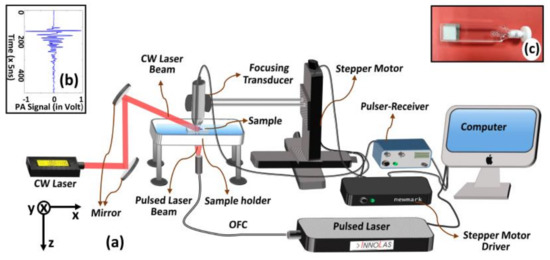 The detected PA-signals were amplified using a pulser-receiver (Part No.: 5073PR-40-P, Olympus, Shinjuku City, Tokyo, Japan) and, then, acquired using a data acquisition card (Part No.: 779745-02, NI PCI-5114, 250 MS/s, National Instruments, Austin, Texas, USA) being attached to a computer system. From time-resolved A-scan, depth-resolved data is obtained (as it was done in previous studies [3,5]). We obtained 2D or 3D data representative of PA-signals by raster scanning. We employed a high precession translation stage (Newmark NSC-G series, Newmark Systems Inc., Rancho Santa Margarita, CA, USA) for raster scanning of the transducer with step-size (~100 µm) while the optical pulse beam and the sample was kept fixed in a position. For a scanning area of ~4.8 × 3 mm2—that can be achieved by ~48 × 30 raster scanning steps—we can acquire an image at the frame rate ~0.69 Hz (~4 frames per min). In addition to pulse (nsec) laser beam, as it is shown in Figure 2a, the imaging sample is illuminated with a collimated optical beam (diameter ~3 mm) from a CW-laser source (Stradus-642-110, VORTRAN Laser Technology, Roseville, CA, USA; wavelength, 642 nm) in such a way that the CW-beam and pulse-laser beam intersect each other at a pre-specified region of interest. Optical wavelengths of CW-illumination (for enhancement of PA-signal strength) and PA-excitation (to induce PA-signals) can be selected independently. CW-laser is continuously switched on during the experiments to maintain the temperature. The entire AR-PAM imaging system is controlled by a LabVIEW-based software. Figure 2b gives a typical 1D PA-signal acquired by our AR-PAM imaging system, while Figure 2c depicts a photograph of the sample holder (transparent cuvette). During experiments, the cuvette filled with sample material (say, methylene blue solution) is completely immersed inside an acoustic-coupling medium (water, in our case) for proper coupling of acoustic signals. We employed AMIRA software for the generation of 3D images from a sequence of 2D images, which are, in turn, reconstructed by using MATLAB.