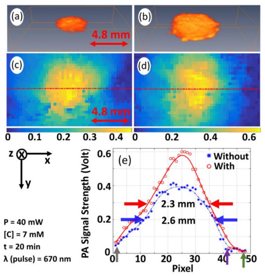 Figure 3 gives the experimental results to compare PA-signal strengths () with and without pre-illumination of CW-laser beam. Experiments were conducted with methylene blue solution (concentration of using water as a solvent) as an imaging sample. Figure 3a,b present 3D image representatives of with and without pre-illumination, respectively, while Figure 3c,d give 2D images corresponding to a randomly selected plane (at ). For quantitative analysis, the variation of along the marked lines, which are indicated in Figure 3c,d, are plotted in Figure 3e. In Figure 3c,d, yellow spot appearing in blue background corresponds to acquired from pulse laser-irradiated spot in sample while the background corresponding to un-illuminated region, which gives no PA-signal. The size and shape of the image, which is characterized by pulse-laser spot, are in agreement with that of cross-section (FWHM) of pulse-laser beam. From Figure 3c,d, it is observed that maximum achievable with pre-illumination is against (without pre-illumination). Average over full-width at of maximum is estimated to be (for pre-illumination) against (without pre-illumination) and enhancement (), corresponding to the plane is found to be . In the similar fashion, for the planes (corresponding to and ) were obtained as and respectively. The average value of the measurements from the three consecutive planes is considered as the with pre-illumination for a particular power and concentration. The results demonstrate that pre-illumination with CW-optical beam provides a significant enhancement in which is due to enhancement in temperature change following optical illumination of CW-beam (as it is given by Equation (5)). Similar experiments were conducted for empty cuvette and water (filled in cuvette) being employed as imaging sample. The experimental results, presented in supplementary figures (Figures S1 and S2), demonstrate that cuvette and water give no significant PA-signal for both of the two cases (with and without pre-illumination). These experimental results imply that is not contributed from sample holder (cuvette) and acoustic-coupling medium (water), or enhancement is contributed only from the sample (methylene blue, in our case).