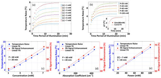 Figure 5 presents the experimental results for characterization studies of the variation of temperature-rise () with various physical parameters of interest. A detailed description of the experimental set-up employed for this study is provided in supplementary (see Figure S4). Figure 5a depicts the variation of with respect to the time interval of pre-illumination of the CW-optical beam where concentration of methylene blue is considered as an experimental parameter. Meanwhile, the variation of with , where optical power of CW-optical beam is considered as an experimental parameter, is shown in Figure 5b. In these figures, it is observed that the temperature raise increases non-linearly and attains saturation at a certain point of the time interval of pre-illumination (). Inset in Figure 5b shows a curve-fit, for 80 mW power of CW-laser, using (where is the maximum temperature raise attained at saturation and γ is a constant that characterizes the growth rate) and it is found that maximum temperature raise is while growth rate, . From the figures, it is observed and are dependent on and optical power of incident CW-beam. Figure 5c shows the variation of temperature raise with which are obtained from Figure 5a with . From Figure 5c, we obtained variation of with and it is shown in Figure 5d. Similarly, the variation of with optical power of CW-beam at is given in Figure 5e. In the figures (Figure 5a–e), , which is presented in Figure 4, is also presented for comparison of and . This linearity in —which is due to increase and subsequent saturation in the absorption of optical energy—is in agreement with that for . From these results (Figure 4 and Figure 5), one may conclude that is dominantly contributed from due to CW-optical pre-illumination in support of our theoretical hypothesis given by Equation (4). This is in agreement with the (simulation and experimental) study, reported by Mahmood et al. [20], that demonstrated and, thus, are dependent on temperature. The time duration for achieving the saturation point of signal enhancement is characteristic of samples, and it can be considered as a preparatory requirement for imaging.