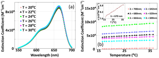 Figure 6 gives the experimental results for the characterization study of variation of optical extinction coefficient () with temperature. For this study, we employed a UV-VIS as spectrum analyzer (PerkinElmer, Lambda 750) and is estimated from absorbance spectrum using where is the (inner) thickness of sample holding cuvette where methylene blue solution is filled in. The sample is heated before introduction to the UV-VIS spectrum analyzer. Temperature () is measured before and after the experiments, and its mean value is considered as the temperature measurement for the particular spectrum analysis experiment. Figure 6a depicts the variation of ε against wavelength while Figure 6b gives the variation of against . From the figure, it is observed that ε varies linearly with where intercept and slope of the linear curve are characteristics of . From this experimentally estimated ε, for a given we estimated the contribution of optical absorption to the enhancement of photoacoustic signal strength (given in Equations (4) and (5)). However, thermal expansion coefficient at any given temperature was estimated using a linear fit of with given in Table 1. Using these measurements of and (in Equations (4) and (5)), we estimated , which we consider as analytical calculation (in Figure 7), wherein thermal perturbation () is adopted from the measurements corresponding to Figure 5.