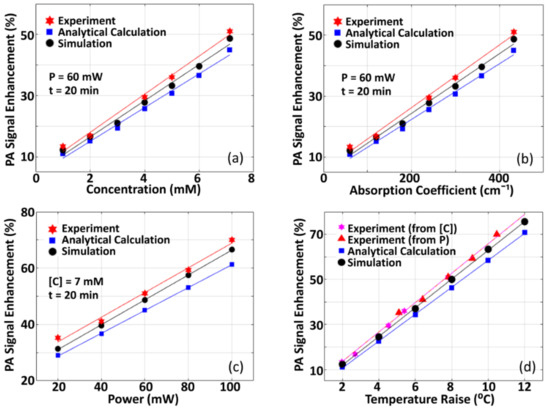 Figure 7 presents the results of numerical simulation studies—for validation of our proposed theoretical hypothesis (presented in Section 2.1)—in comparison to the experimental results (given in Figure 4). In the meantime, , which is estimated theoretically or analytically using Equations (4) and (5), is also included. Variation of with respect to , , optical power of CW-beam (used for pre-illumination), and are shown in Figure 7a–d. We estimate the slopes for variation of with: (i) concentration as (from experiments) against (from analytical calculation) and (from simulations), (ii) optical absorption coefficient as (from experiments) against (from analytical calculation) and (from simulations), (iii) optical power of CW-beam as (from experiments) against (from analytical calculation) and (from simulations), (iv) temperature raise (due to concentration or optical power) as (from analytical calculation) and (from simulations). In the figures, it is observed that slopes of the variation of with the physical parameters of interest, obtained from experiments and numerical simulations, are in good agreement. This demonstrates that the proposed hypothesis of the dependence of and on (as it is given in Equations (4) and (5)) is validated. A deviation in absolute measurements of enhancement, as it is observed in Figure 7, may be due to lower in measurement of temperature of the imaging sample at a pre-specified region of interest—over which CW laser beam illuminates—resulting from tips of the (thermocouple) temperature sensor not being situated exactly at the point of illumination while attempting to prevent direct exposure of the tips to the incident light beam. To note, direct exposure of light to thermocouple tips results in the heating of the tips, which gives inaccurate measurements of the temperature of the medium.