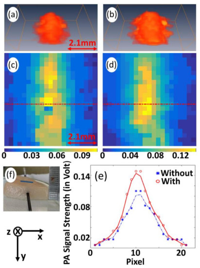 To validate the proposed technique for enhancement of PA-signal strength, in preclinical and/or clinical studies, experiments were conducted in tissue-mimicking Agar-phantom as well as biological tissue (chicken breast collected from supermarket). Experimental results are depicted in Figure 8 (for Agar phantom) and Figure 9 (for chicken tissue). Figure 8a,b give 3D images representative of obtained without and with pre-illumination. Figure 8c,d depict 2D images (corresponding to in 3D images). Line plots, showing the variation of and along marked lines indicated in Figure 8b,c, are depicted in Figure 8d. is found to be which is in agreement with increase in the Grüneisen parameter with temperature (for biological tissue) [8,20]. It is observed that the measured is significantly enhanced with pre-illumination of CW-laser beam. Figure 8f gives a photograph of Agar-sample where a target () was embedded in a background phantom (). Similar to reported studies [3,5], optical and elastic properties were tailored such that the target has only contrast in with respect to background ( (target) against (background)). Figure 9a,b gives 3D images, while Figure 9c,d give 2D images, representative of obtained without and with pre-illumination. Line plots, showing the variation of and along the marked lines indicated in Figure 9b,c, are depicted in Figure 9d. is estimated and found to be which is a significant enhancement with pre-illumination of CW-laser beam. Figure 9f gives a photograph of the chicken breast tissue sample where a transparent (glass) tube of inner diameter ) is inserted through the chicken breast sample at depth . The tube was filled with methylene blue, whereby mimicking deep-seated blood vessels in (chicken breast) tissue sample. In Figure 8, one observes that PA-representative image of the rectangular-shaped target appears to be circular (against appearing as a line in Figure 8c and Figure 9c). This is because of the pre-illumination of CW-laser beam, which is circular in cross-section. These results, with experiments being conducted in (chicken) tissue sample, demonstrate the practical applicability of the proposed photo-thermal technique to pre-clinical and/or clinical studies.