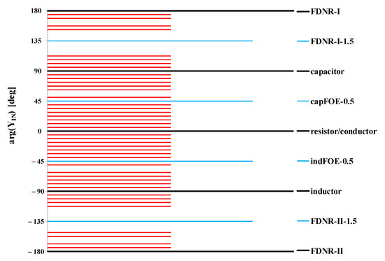 To better comprehend the advantage in utilizing “seed” FOEs, even 51 different values of fractional order , still from the range , can be obtained by assuming and . As a result, for each , the input admittance (8) features a phase angle from the range deg as illustrated in Figure 2. The specific combinations of external admittances types defined by their is summarized in Table A2. Hence, it may be obvious that using a very limited set of “seed” FOEs, a broad series of new fractional order elements primarily with different fractional order may be obtained. Furthermore, by adjusting the values of external capacitors (C), conductors (G), and most preferably also the transcondustance g of the active/passive network it is possible to obtain a generally arbitrary value of the fractance being observed at the input of the GIC.