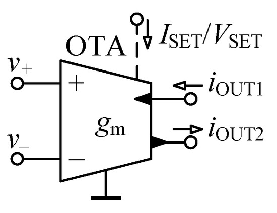 The OTA, whose circuit symbol is shown in Figure 3, specified with its transcondutance is a source of current controlled by a difference of input voltages and [50]: