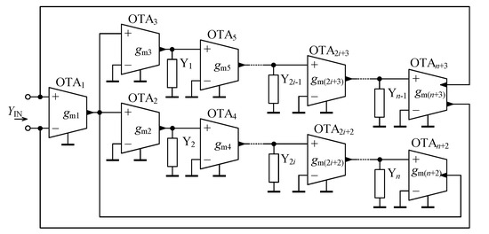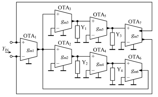 In Figure 4, the novel configuration of a general immittance converter is shown. Taking into account the basic terminal relationship of OTA (10) and performing routine algebraic analysis, the input admittance is determined as: