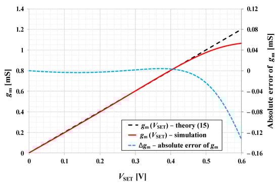 The dependence of on of the OTA from Figure 6 obtained by Cadence simulations is given in Figure 7 (solid red line). It may be observed that (15) is valid for in the range 0 to 0.5 V and proves the possibility to electronically set between 0 and 1 mS, whereas the maximum absolute error is 0.02 mS (Figure 7; dashed blue line). Detailed analysis of the OTA and discussion of its parameters is given in [51]. Here we further aim to analyze the influence of real properties of OTAs on the overall performance of the proposed GIC.