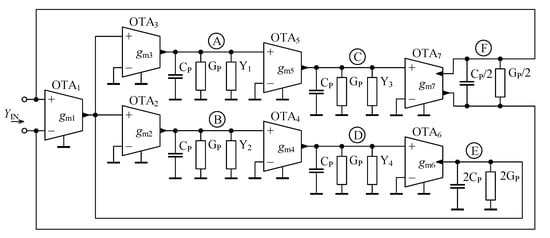 To solely evaluate the influence of OTA parasitic properties, as well as FOEs, resistors, and capacitors used to replace the admittances Y, Y, Y, and Y are assumed to be ideal. For clarity, the nodes and input port, where the modeled parasitics are present are labeled by circled letters A to F in Figure 8.