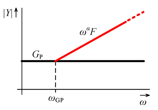 In case of ideal OTAs, the order of the admittance of the node E () equals to , and hence can range from 0 to . Thus the character of the admittance ranges from resistive through fractional inductive, inductive, fractional FDNR-II to FDNR-II. The resistive character will be not included in the analysis, as in this case the whole lower branch including OTA, OTA, and OTA can be omitted and replaced by a resistor and a similar conclusion as described in Section 4.2.1 is reached. Considering all other possible characters of , the OTA parasitic properties affect the circuit mainly at high frequencies, since the admittance magnitude being defined as: