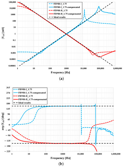 In theory, using the proposed OTA-based general immittance converter from Figure 4, the feasible range of the fractional order is , whereas n is generally an arbitrary even integer number.
