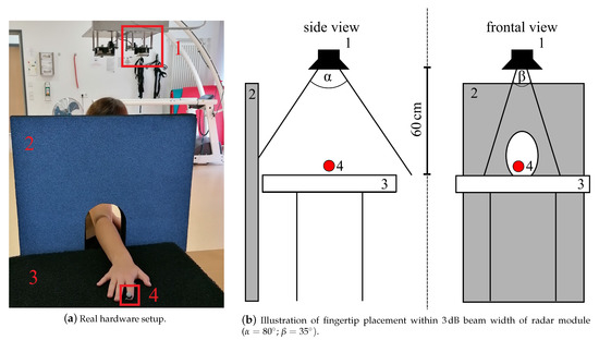 Radar measurement setup: 1—CW radar, 2—absorber wall, 3—absorber mat on table, 4—optical marker placed on fingertip to collect reference data.
