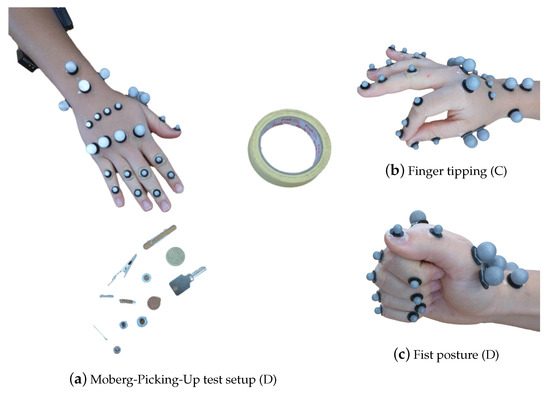 - Schröder, M.; Maycock, J.; Botsch, M. Reduced Marker Layouts for Optical Motion Capture of Hands. In Proceedings of the 8th ACM SIGGRAPH Conference on Motion in Games (MIG ’15), Paris, France, 16–18 November 2015; Association for Computing Machinery: New York, NY, USA, 2015; pp. 7–16. [Google Scholar] [CrossRef]