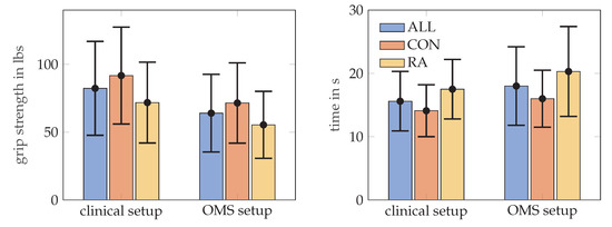 Forty-seven individuals participated in this study with a mean age of 56.3 ± 14.2 years (29 females and 18 males). This included 23 healthy control subjects with ages 50.2 ± 16.1 years (12 females and 11 males) and 24 patients with RA with ages 62.3 ± 9.1 years (17 females and 7 males). Mean patient reported disease activity (VAS global disease activity) was 29.4 (standard deviation 25.8). The choice to undertake measurements for either one or both hands provided us with measurement data for total hands with healthy controls and RA patients hands. MPUT times and grip strength results for clinical and OMS setup are summarized in Table 2.