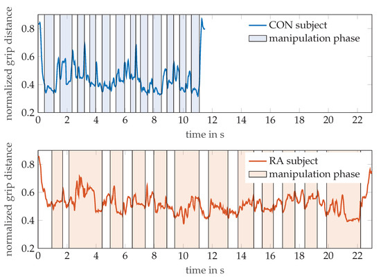 The normalized grip distances between thumb tip (T5) and index finger DIP (I4) markers are shown for a participant each from the control and RA groups, while performing the MPUT. The shaded and non-shaded areas in each plot correspond to the manipulation and prehension motions, respectively.