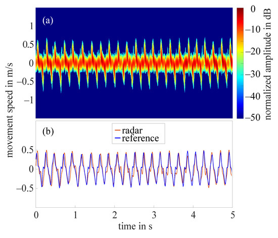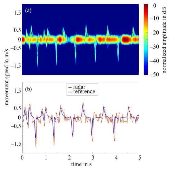 (a) Short-time Fourier transform of an example measurement with amplitude value 10 dB; (b) extracted fingertip speed of radar measurement shown in (a) and reference data collected by OMS.