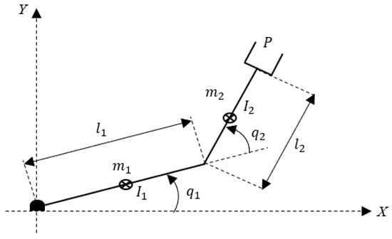 Figure 1 shows the parameters of a 2-DOF planar robot with revolute joints that is evaluated in this work. The joint variable are represented by , the length of the links is the link mass is , the moments of inertia with respect to the Z-axis are denoted by , for , and the end effector is indicated by .