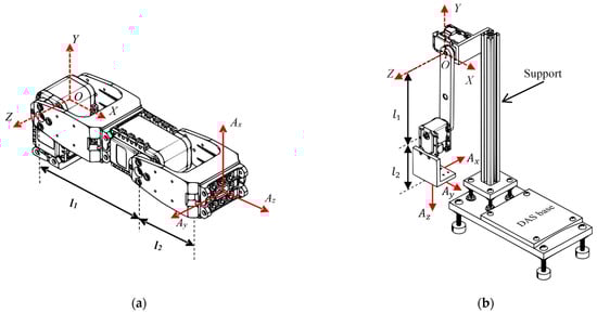 In the experiment, the vibration signal was acquired to identify the NFs of the robots. In both cases, an InvenSense model MPU-6050 triaxial accelerometer was used for measuring the vibration signals of robots, which was placed on the end effector of the robot (shown in Figure 7). The accelerometer had a user-selectable full scale of and ( m/s2), with a resolution of over a bandwidth. A DAS composed of an Atmel microcontroller and a 16-bit analog-to-digital converter was employed to acquire the vibration signals. The vibration signals measured by the accelerometer were stored in the DAS and sent to a PC using the USB protocol. The DAS used a sampling frequency of during a time window of for every test, obtaining samples for each test.