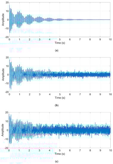 where is the respective amplitude of the i-th mode, is the phase lag, and is the damped natural frequency. According to Equation (6), the synthetic signal is generated with the following parameters: , meaning that there are four natural frequencies, Hz, Hz, Hz, Hz, and , , , , for the amplitudes. It uses a sampling frequency of Hz and a time window of s for generating a data set of samples. Simulated proposed signals without noise, with moderate-level noise, and with high-level noise, are shown in Figure 4.