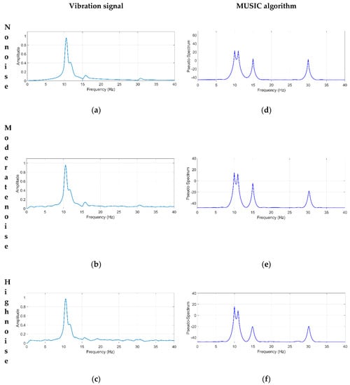 Spectra obtained by the FFT method for a signal with (a) no noise, (b) moderate-level noise, (c) high-level noise, and spectra obtained by the MUSIC method for a signal with (d) no noise, (e) moderate-level noise, and (f) high-level noise.