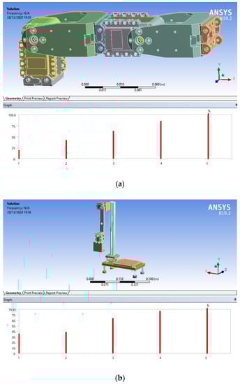 After setting the parameters and constraints of the numerical model, a FEM is applied to each case of study with the position shown in Figure 2 to calculate the NFs for each robot. The numerical results obtained by ANSYS™ are presented in Figure 6. It should be mentioned that the path of the end effector of the robot does not reach frequencies higher than [,,]; hence, in this paper, the first five NFs of the robot are considered, which are inside this frequency range.