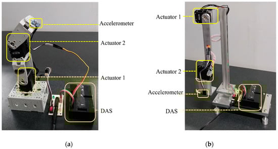 The analyzed 2-DOF platforms in this work are presented in Figure 2, where the fixed reference frame has dashed lines and correspond to the accelerometer coordinate system attached to the end effector of the robot. Table 1 presents characteristics, such as the actuator models, material links, and weights of the two experimental platforms of 2-DOF. Table 2 presents the characteristics of the actuators, i.e., weight, dimension, and maximum torque, employed in the analyzed planar robots [].