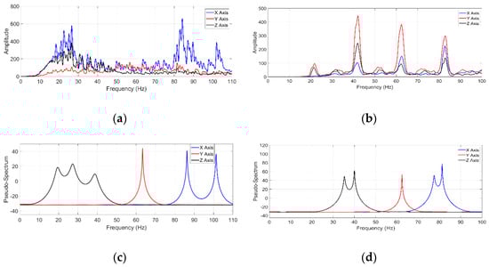 Once the vibration signals were acquired, the processing was carried out using the MUSIC algorithm and the FFT method to make a comparison. Figure 9 shows the spectra for the two cases of study; Figure 9a,b corresponds to the FFT method, while Figure 9c,d corresponds to the MUSIC algorithm.