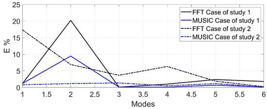 Table 3 summarizes the NFs estimated by the FFT and MUSIC methods and the error generated by both methods compared to the theoretical values. Observing Table 3, the maximum errors for NFs identification using the FFT method and the proposed MUSIC algorithm method are and , respectively. Hence, these results demonstrate clearly that the MUSIC algorithm is immune to noise and can identify the NFs accurately.