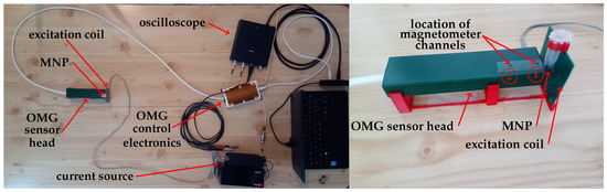 Our setup (Figure 1) consists of a single commercially available sensor package containing two separate total field pulsed OPM (OMG—Optical Magnetic Gradiometer from Twinleaf LLC, Plainsboro Township, NJ, USA) and an excitation system for MNP alignment. The unshielded experiments were performed in a laboratory environment, with the Earth’s field as background magnetic field. For the MRX experiments, the MNP samples were placed—one at a time—between the excitation coil and the OMG (Figure 1). The center of the sample is located at a distance of from the center of the first magnetometer channel.