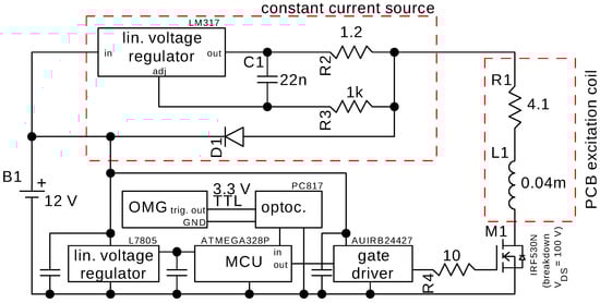 A single planar rectangular spiral printed circuit board (PCB) coil (Figure 1) was fabricated and used to align the magnetic moments of the nanoparticles. The schematic of the coil driver is shown in Figure 2. Most critical is the fast current shut-off with minimal ringing. For a fast switch-off, the energy stored in the coil has to be dissipated rapidly. The use of a free wheeling diode, often used to protect electronics from voltage spikes of switched inductive loads, is not recommended for this purpose. The clamping voltage of a standard diode is low, e.g., 0.7 V and so is the dissipated power, leading to a slow shut-off of the magnetic field. An increased clamping voltage can be obtained by the use of a transient voltage suppression (TVS) diode and is limited by the maximum allowed drain-source-voltage of the MOSFET which needs to be protected. Alternatively, an avalanche rated MOSFET can be used [13,44]. Due to the low inductance of the PCB coil of and the current of , the stored energy is well within the avalanche limits of the IRF530-MOSFET used here and no additional TVS-diode is required.