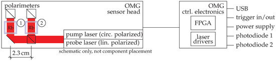 The key to a very short OPM dead time is the use of a high intensity, pump beam laser to rapidly polarize alkali metal atoms in the sensor. The sensor employs two vapor cells with a vapor of rubidium atoms (enriched 87Rb). After pumping, the atoms freely precess and their projection is monitored by optical rotation of a linearly polarized probe beam light. The off-resonance probe beam light is generated by a single mode, polarization stable vertical-cavity surface-emitting laser (VCSEL). Both, the pump and probe laser are tuned near the 795 rubidium resonance manually. The rubidium polarization relaxation rate is dominated by spin-exchange relaxation. With the pump beam shut off for the duration of the measurement a class of systematic errors from pump lightshift to pointing noise are completely eliminated, resulting in a very clean and high precision frequency-based magnetic field measurement. The high power optical pumping substantially resets and erases the time history of the alkali polarization, rendering an independent magnetic field measurement each . It should be noted that there is no frequency feedback or resonance tracking as used in other types of self-oscillating magnetometers. This also enhances OPM bandwidth. The different elements of the commercially available sensor are sketched in Figure 3. The sensor is composed of two magnetometers; i.e., it houses two vapor cells. The pump beam and probe beam are split and distributed to the two cells, enabling a future common laser noise reduction as in [49]. The two amplified photodiode signals are available as analog outputs of the OPM control electronics. Additionally, the signals are filtered with a passband between 100 and and are fed into an FPGA inside the OMG control electronics, which measures the frequency and sends the result via USB connection.