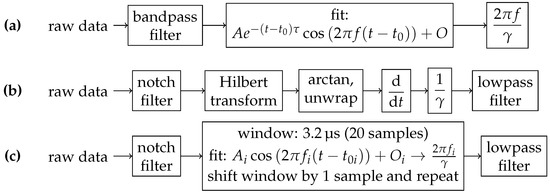The phase-estimation is a critical step in the procedure and several algorithms have been proposed [50,51]. While (e.g., after signal normalization) simply applying arccos might be the direct approach, the phase-unwrapping in this case is tricky [52]. Another well known approach is the instantaneous phase estimation via Hilbert transform. The Hilbert transform can be interpreted as a phase shifter. The instantaneous phase can therefore be calculated by unwrapping . When calculating the Hilbert transform numerically, some limitations have to be known: The modulation frequency must be smaller than the precession frequency at , otherwise generated frequency sidebands are discarded. However, by separate treatment they still can be demodulated [36]. Typical Hilbert transform implementations are realized as digital filter or incorporate a Fourier transform. Therefore, distortions of the estimated phase near the data-boundaries arise. There are several ways to account for this, e.g., by padding/extrapolating the raw data with, e.g., a mirrored version of the raw signal. However, in this work no padding is used, but the first data points are discarded (as described in the following). This could be addressed in future improvements.