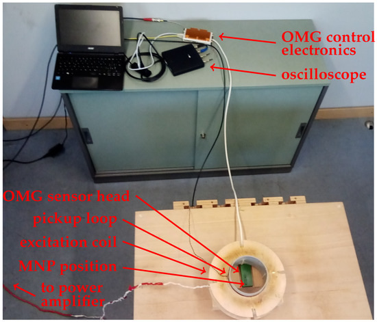 Unshielded OPM-MRX setup with possible MRX excitation fields of up to 100 mT. The battery powered notebook, the USB-oscilloscope and the OMG control electronics are visible on the upper part of the figure. The OMG’s sensor head and the MRX excitation-coil are visible in the lower part of the figure. The position where the MNP sample was later placed is indicated by an arrow. The power amplifier is not visible, as it is located at a distance of about 3 m.
