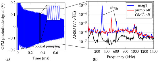 The signal corresponds to the free spin precession of the alkali atoms. At timestamp , the pump laser is activated, which saturates the photodiode amplifier. The amplitude spectral density of the precession signal is shown in Figure 6b. Three spectral densities are shown: OMG in normal operation mode; with deactivated pump laser and therefore with no visible polarization rotation; with the OMG completely unpowered. The noise spike at arises from the OPM electronics and not from the switched mode power supply. This was verified using a linearly regulated power supply. The signal component is the free-precession signal of 87Rb and corresponds to the Earth’s magnetic field of . The harmonic at may arise due to orientation-to-alignment conversion due to the linearly polarized probe laser or due to a background magnetic field with a vector component parallel to the pump beam [56,57].