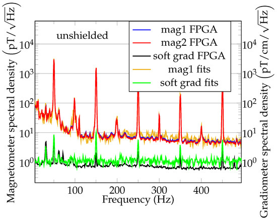 In the case of magnetic field readings, the data in Figure 6a are converted to one single value of the magnetic field time series. The exemplary unshielded sensor performance with reduced pumping time for MRX is shown in the amplitude noise spectral density (ANSD) plot; see Figure 7. In addition to the FPGA-data noise, the noise floor of the first magnetometer channel in the software gradiometer as estimated from sine-fits (method (a) in Figure 4) is shown in brown/green. The noise level of the FPGA data and fit data is about at for the magnetometers. The software gradiometer noise floor of the FPGA data is about , and it is for the fit data. The noise floor of the fits is now compared to the CRLB. results from a fit of the filtered free precession decay signal to the theoretical model (Equation (5)). Together with the sampling time , this results in . The amplitude , the spectral noise density and the repetition time result in a theoretical lower bound of the magnetic noise density of for the fit data. The theoretical gradiometric noise floor for the fit data scales with , which gives . As it can be observed in Figure 7, the gradiometric noise floor obtained by the FPGA is lower than the one obtained by curve fitting. The reason is that the curve fitting results are limited by quantization noise of the oscilloscope, while the FPGA readings are of higher precision. An analysis of the FPGA performance can be found in the appendix of [43], while attention has to be paid to the larger baseline and the lower sampling rate used in [43].